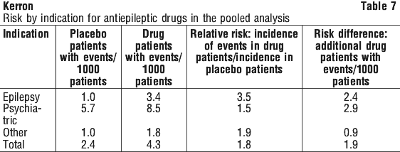The relative risk for suicidal thoughts or behaviour was higher in clinical trials for epilepsy than in clinical trials for psychiatric or other conditions, but the absolute risk differences were similar for the epilepsy and psychiatric indications.