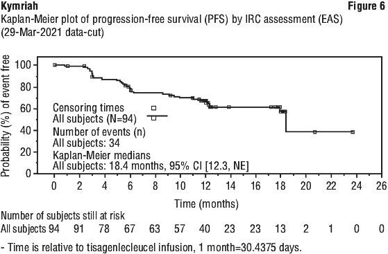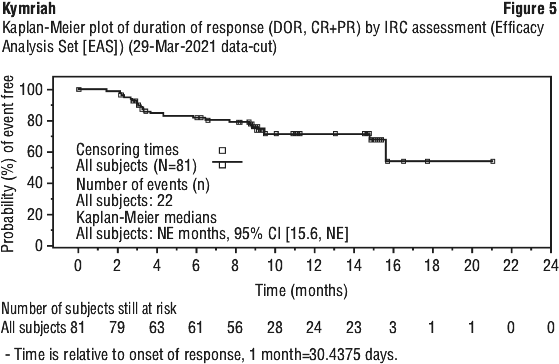 Efficacy was established through the primary endpoint of overall remission rate (ORR), within 3 months post infusion, as determined by Independent Review Committee (IRC) assessment. Secondary endpoints included duration of remission (DOR) and the proportion of patients who achieved complete remission (CR) or complete remission with incomplete blood count (Cri) with minimal residual disease (MRD) < 0.01% by flow cytometry (MRD-negative). The ORR at 3 months was 81% (61/75). The median time from Kymriah infusion to the data cut-off date was 13.11 months (range: 2.1 to 23.5). See Table 5 and Figure 1 and Figure 2 for efficacy results from this study. Fifty-seven of 61 responders achieved CR/CRi by the Day 28 assessment. ORR was consistent across all subgroups. Seven patients who received Kymriah infusion went to transplant while in remission. Seventy six percent of patients were hospitalized at the time of infusion and 24% were not hospitalized at the time of Kymriah infusion.