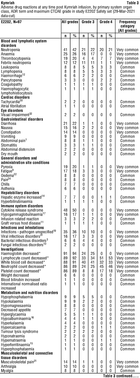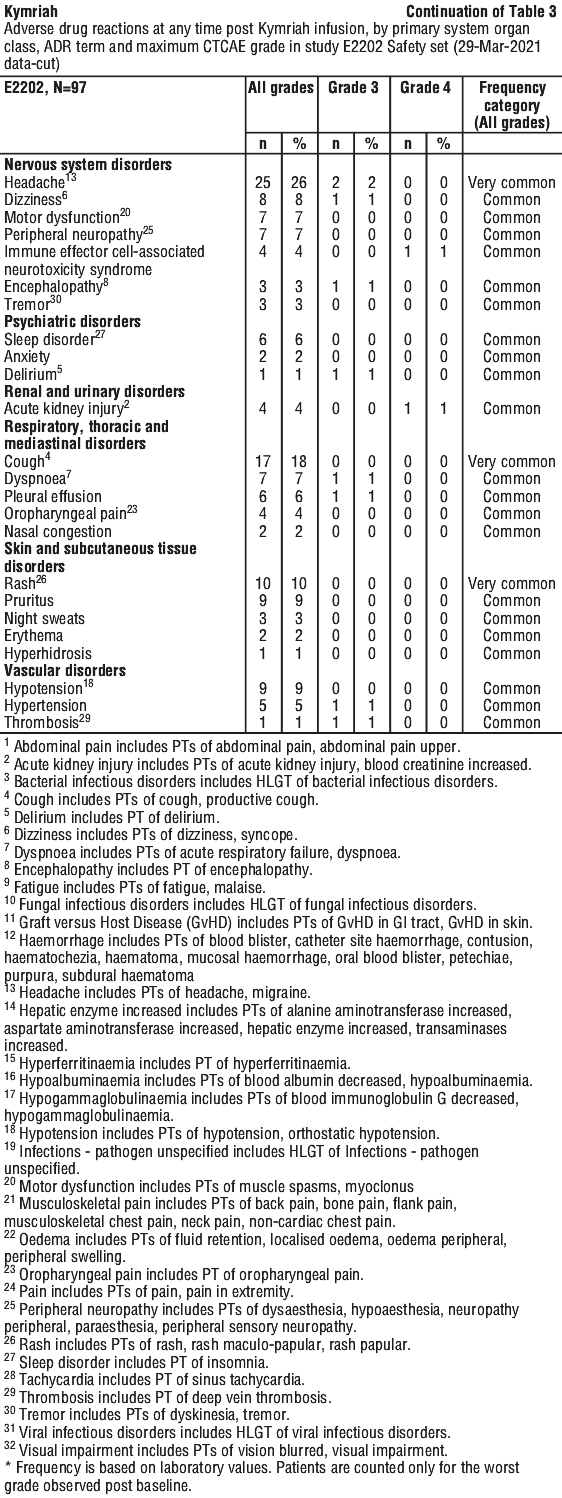 - Relapsed or refractory diffuse large B-cell lymphoma (DLBCL) after two or more lines of systemic therapy - a form of cancer that affects some types of white blood cells, mostly in the lymph nodes. It can be used in adults (18 years of age or older) with this cancer. Kymriah is not indicated for patients with primary central nervous system lymphoma