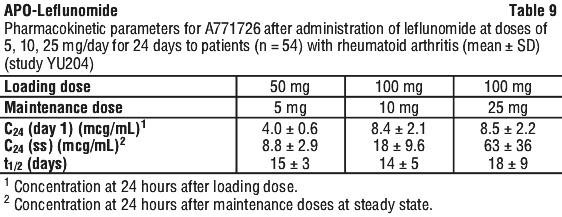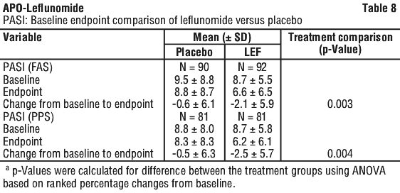 In a differing analysis which excluded some patients, the Psoriasis Area and Severity Index (PASI) was assessed to reflect changes in the extent and severity of psoriasis lesions as judged by erythema, desquamation and infiltration. Leflunomide resulted in a significant improvement in PASI scores over the 24-week study relative to placebo, with a mean (± SD) improvement of 22.4% (± 51.6%) in the leflunomide group compared with a deterioration of 2.2% (± 70.4%) in the placebo group (p = 0.0030). See Table 8.
