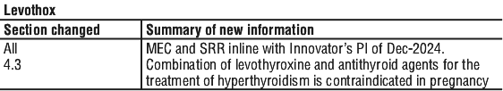 Do not interchange Levothox and other levothyroxine containing products. If a decision is made to switch from another levothyroxine product to Levothox, then prescribers should be aware that dose adjustment may be required; TSH should be monitored.