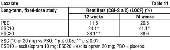 The beneficial effect of long-term treatment with escitalopram was also reflected in the analyses of responders and remitters in this study. The analyses showed a further increase both in the proportion of responders and in the proportion of remitters from week 12 to week 24, especially in the escitalopram 20 mg group. At week 24, a statistically significantly greater proportion of responders and remitters were seen in all three escitalopram dose groups (except for the proportion of responders in the 10 mg group) than in the placebo group (p ≤ 0.01) (see Tables 5 and 6).