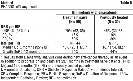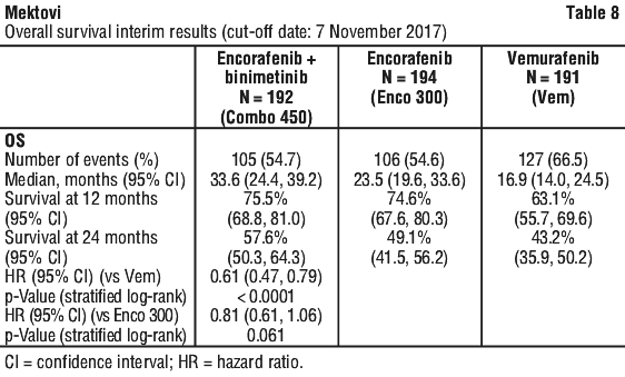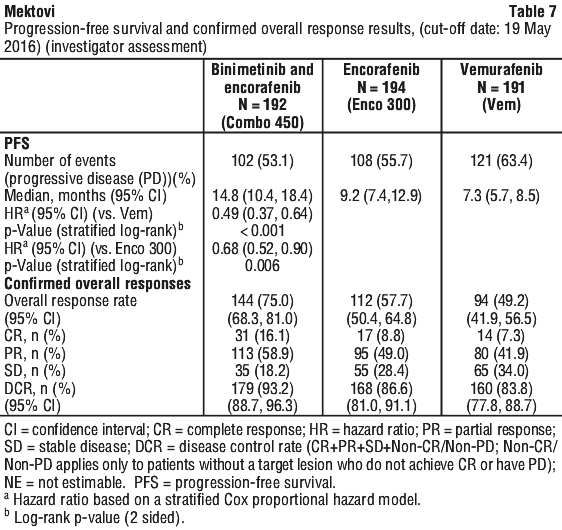 At a cut-off date of 07 November 2017, an update of the PFS analyses was performed. The PFS analysis per independent central assessment showed an improvement of PFS in patients treated with Combo 450 compared with patients treated with vemurafenib (14.9 vs 7.3 months, respectively), HR 0.51 (95% CI: 0.39, 0.67) (p < 0.001 one sided) and also compared with patients treated with encorafenib (14.9 vs 9.6 months, respectively), HR 0.77 (95% CI: 0.59, 1.0) (p = 0.0249 one sided). The analysis per independent central assessment showed that encorafenib improved PFS vs. vemurafenib (9.6 vs 7.3 months, respectively), HR 0.68 (95% CI: 0.52, 0.88) (p = 0.0019 one sided).