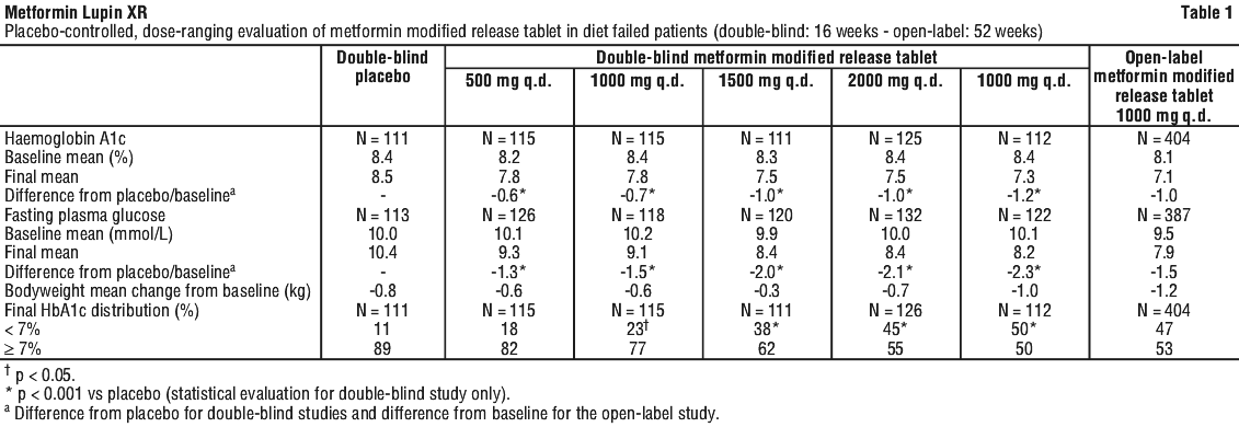 Both placebo-controlled studies were in diet-failed patients previously not exposed to metformin. One study evaluated once-daily metformin modified release tablet at daily doses of 500 mg, 2 x 500 mg, 3 x 500 mg, and 4 x 500 mg, and also twice-daily 2 x 500 mg, for 16 weeks. Treatment with once-daily metformin modified release tablet resulted in dose-related reductions in indices of glycaemic control (HbA1C, fasting plasma glucose [FPG] and the proportions of patients achieving HbA1C < 7.0% at study end or last prior measurement) that were significant at all doses relative to placebo (Table 1). The results of a 52-week open-label extension to this study (Table 1) showed that the anti-hyperglycaemic effects of metformin modified release tablet were maintained over time. There was no weight gain in any treatment group.
