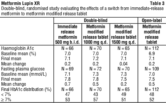 The third randomised, double-blind study evaluated the effects of switching from the immediate-release formulation of metformin to metformin modified release tablet. Patients sub-optimally controlled with metformin received immediate-release metformin 500 mg twice daily, were randomised to continue on immediate-release metformin or to receive once-daily metformin modified release tablet at a dose of 2 x 500 mg or 3 x 500 mg, for a period of 12 weeks. Indices of glycaemia were not markedly altered after switching between the formulations, either in the double-blind study or an associated 52-week open-label study (Table 3).