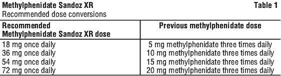The recommended starting dose of Methylphenidate Sandoz XR for patients who are not currently taking methylphenidate, or for patients who are on stimulants other than methylphenidate, is 18 mg once daily.