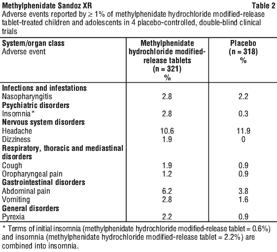 Adverse events (AEs) reported by ≥ 1% of methylphenidate hydrochloride modified-release tablet-treated children and adolescents patients in these trials are shown in Table 2.