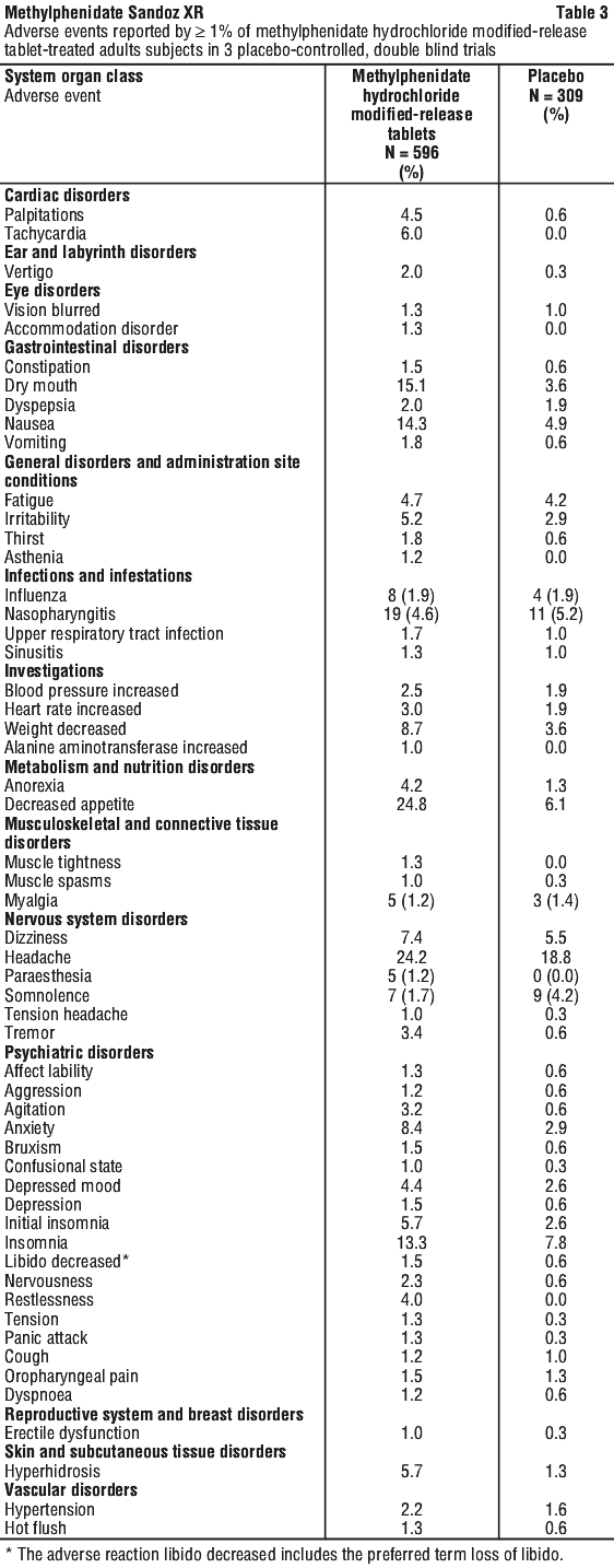 The safety of methylphenidate hydrochloride modified-release tablets was evaluated in 905 adult subjects with ADHD who participated in 3 placebo-controlled, double-blind clinical trials. The information presented in this section was derived from pooled data.
