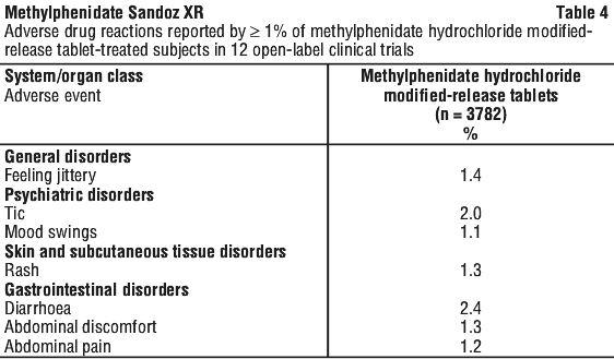Open label data - adverse drug reactions reported at ≥ 1% frequency. The safety of methylphenidate hydrochloride modified-release tablets was evaluated in 3782 paediatric and adult patients with ADHD who participated in 12 open-label clinical trials. The information presented in this section was derived from pooled data.