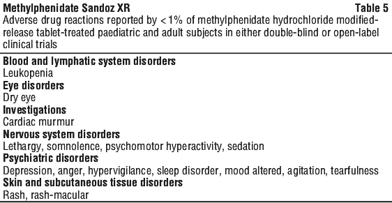 Double blind and open label data - adverse drug reactions reported at < 1% frequency. Additional ADRs that occurred in < 1% of methylphenidate hydrochloride modified-release tablet treated paediatric and adult patients in the double blind and open label clinical datasets are listed in Table 5.