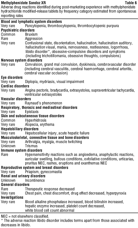 Adverse events first identified as ADRs during post-marketing experience with methylphenidate hydrochloride modified-release tablets are included in Table 6. The frequencies are provided according to the following convention: very common ≥ 1/10; common ≥ 1/100 and < 1/10; uncommon ≥ 1/1000 and < 1/100; rare ≥ 1/10,000 and < 1/1000; very rare < 1/10,000, including isolated reports.