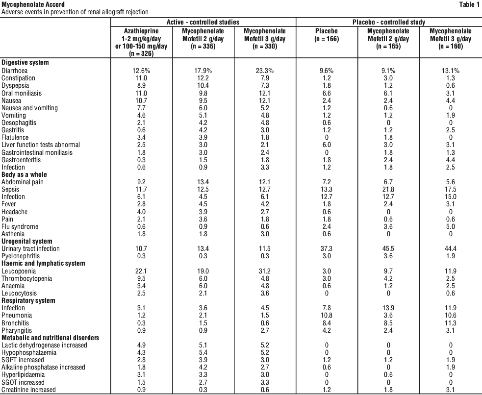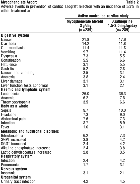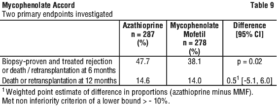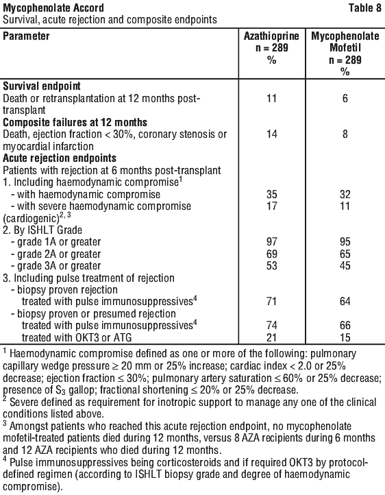 In a randomised, double-blind, parallel active-controlled multicentre study to compare the safety and efficacy of MMF 1.5 g twice daily with azathioprine 1.5 - 3 mg/kg/day, both in combination with ciclosporin and corticosteroids, 650 patients were randomised to the two arms. The primary endpoints investigated were (1) prevention of biopsy-proven acute rejection with haemodynamic compromise during the first six months following transplantation and (2) prevention of death or retransplantation during the first year following cardiac transplantation. 72 patients were withdrawn prior to administration and without knowledge of the assigned therapy primarily because of perioperative adverse events, inability to take oral medication or death. Therefore, 289 patients received study medication in each arm.