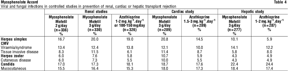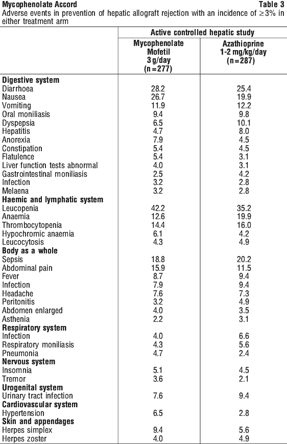 0.5% of patients receiving mycophenolate mofetil 2 g for prevention of rejection in renal transplantation, 2.8% of patients receiving mycophenolate mofetil 3 g in cardiac transplantation and 3.6% of patients receiving mycophenolate mofetil 3 g in hepatic transplantation, developed severe neutropenia (absolute neutrophil count [ANC] < 5 x 108/L).