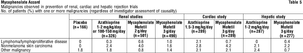 As with other patients receiving immunosuppressive regimes involving combinations of medicines, patients receiving Mycophenolate Accord as part of an immunosuppressive regime are at an increased risk of developing lymphomas and other malignancies, particularly of the skin. The risk appears to be related to the intensity and duration of immunosuppression rather than the use of any specific agent. Approximately 1% of patients receiving mycophenolate mofetil with other immunosuppressive agents in the controlled studies of prevention of rejection have developed lymphoproliferative disease or lymphoma. As immunosuppression increases the risk of skin cancer, patients should also be advised to limit their exposure to sunlight and other sources of UV light by wearing protective clothing and using sunscreen with a high protection factor.