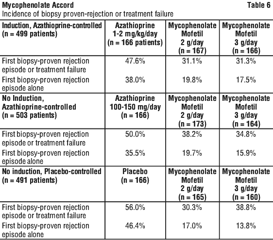 In these three studies, the proportion of patients requiring antilymphocyte therapy for treatment of rejection during the first 6 months following transplantation was smaller among patients receiving mycophenolate mofetil 2 g per day (5.5 to 10.3%) or mycophenolate mofetil 3 g per day (3.1 to 5.4%) than among patients receiving azathioprine or placebo (15 to 21%).