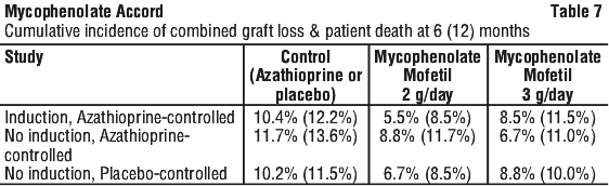 Six and twelve-month patient survival and graft survival was somewhat higher in the patients receiving mycophenolate mofetil in comparison to either azathioprine or placebo. The cumulative proportions of patients who had died or lost their graft by 6 and 12 months' post-transplant were as follows (see Table 7):