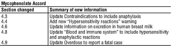 Mycophenolate Accord is contraindicated in patients with a history of hypersensitivity, including anaphylaxis, to mycophenolate mofetil (MMF), to mycophenolic acid (MPA) or any component of the drug product.