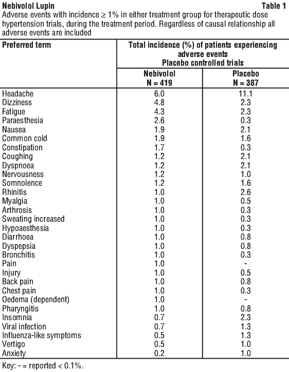 The most common side effects of Nebivolol Lupin are headache, tiredness, nausea or vomiting, stomach upset, wind, diarrhoea, constipation, and coldness or numbness in the hands or feet. Call your doctor straight away or go straight to the Emergency Department at your nearest hospital if you experience swelling of the face, lips, tongue or throat that may cause difficulty swallowing or breathing; chest tightness, shortness of breath or difficulty breathing; swelling of the feet and ankles; or chest pain or changes in heart rate.