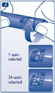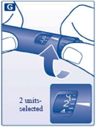 Turn the dose selector to select the number of units you need to inject. The dose can be corrected either up or down by turning the dose selector in either direction until the correct dose lines up with the pointer. When turning the dose selector, be careful not to push the push-button as insulin will come out.