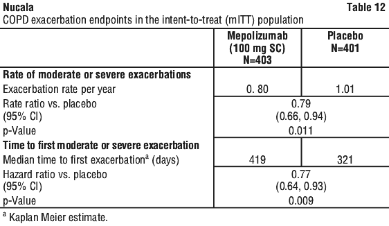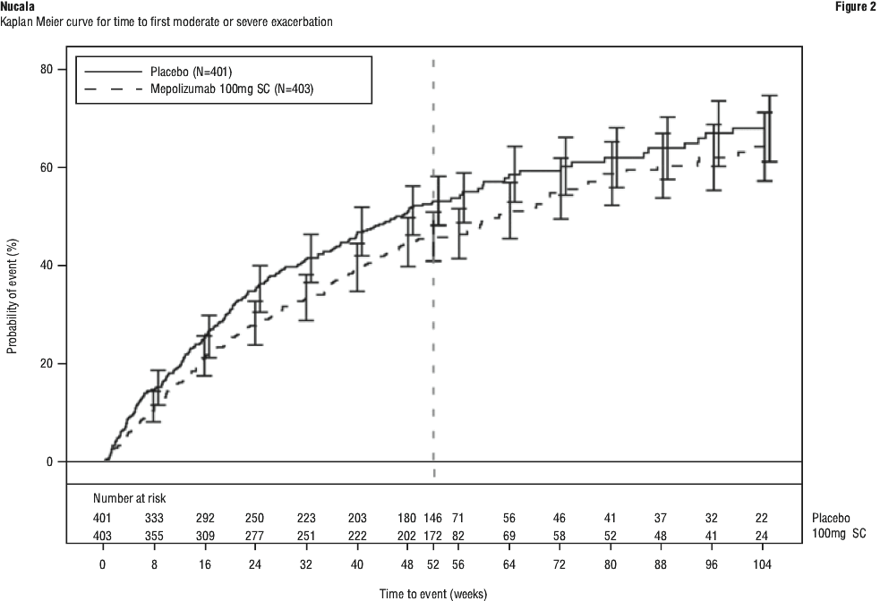 Additionally, health related quality of life was measured using SGRQ. At Week 24, there was a statistically significant improvement in the mean SGRQ score for mepolizumab compared with placebo: -5.8 (95% CI: -10.6, -1.0; p = 0.019). At Week 24, the proportion of subjects with a clinically meaningful decrease in SGRQ score (defined as a decrease of at least 4 units from baseline) was greater for mepolizumab (58%, 40/69) compared with placebo (41%, 27/66).