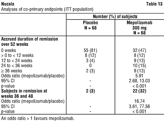 Additionally, a statistically significant benefit for these endpoints was demonstrated using remission defined as BVAS = 0 plus prednisolone/prednisone ≤ 7.5 mg/day. There was a greater accrued time in remission in the mepolizumab group compared with placebo, in subjects with a baseline blood eosinophil count (BEC) ≥ 150 cells/microL.