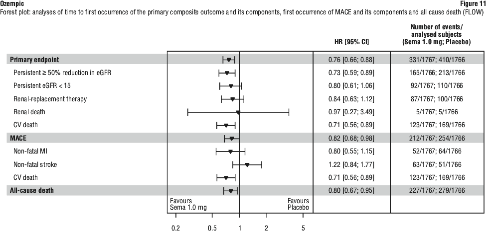 The individual components of the primary composite contributed to the treatment effect. There were only a small number of kidney deaths in the trial (see Figure 11: Forest plot: analyses of time to first occurrence of the primary composite outcome and its components, first occurrence of MACE and its components and all cause death (FLOW)). The treatment benefit of Ozempic over placebo on the primary composite outcome was generally consistent across the pre-specified subgroups.