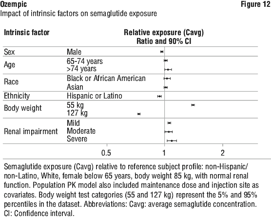 No dose adjustment of semaglutide is needed based on age, gender, race, ethnicity, body weight, or renal or hepatic impairment. The effects of intrinsic factors on the pharmacokinetics of semaglutide are shown in Figure 12.