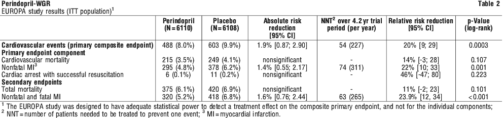 The effects of perindopril were compared to placebo in patients with stable coronary artery disease with no clinical signs of heart failure. The EUROPA (European trial on Reduction Of cardiac events with Perindopril in stable coronary Artery disease) study was a multicentre, international, randomised, double blind, placebo-controlled clinical trial lasting 4 years. 12218 patients aged over 18 were randomised: 6110 patients to high dose perindopril 8 mg and 6108 patients to placebo.
