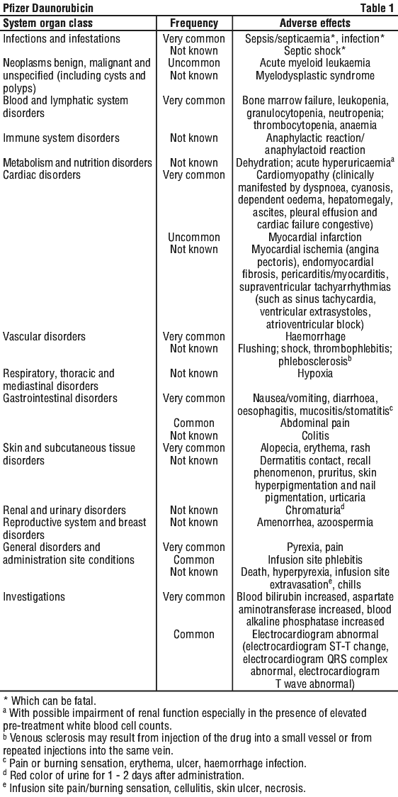 Administration of myelosuppressive drugs such as daunorubicin may lead to an increased frequency of infections and haemorrhagic complications. These complications are potentially fatal therefore patients should be instructed to notify the physician if fever, sore throat, or unusual bruising or bleeding occurs.