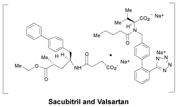 Chemical name (IUPAC): Sodium 4-[[(2S,4R)-5-ethoxy-4-methyl-5-oxo-1-(4phenylphenyl) pentan-2-yl]amino]-4-oxobutanoate and disodium (2S)-3-methyl-2[pentanoyl-[[4-[2-(2H-tetrazol-5-yl) phenyl]phenyl]methyl]amino]butananoate.