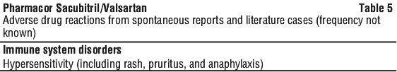The following adverse drug reactions have been derived from post-marketing experience with sacubitril/valsartan via spontaneous case reports and literature cases. Because these reactions are reported voluntarily from a population of uncertain size, it is not possible to reliably estimate their frequency, which is therefore categorised as not known. Adverse drug reactions are listed according to system organ classes in MedDRA (see Table 5).