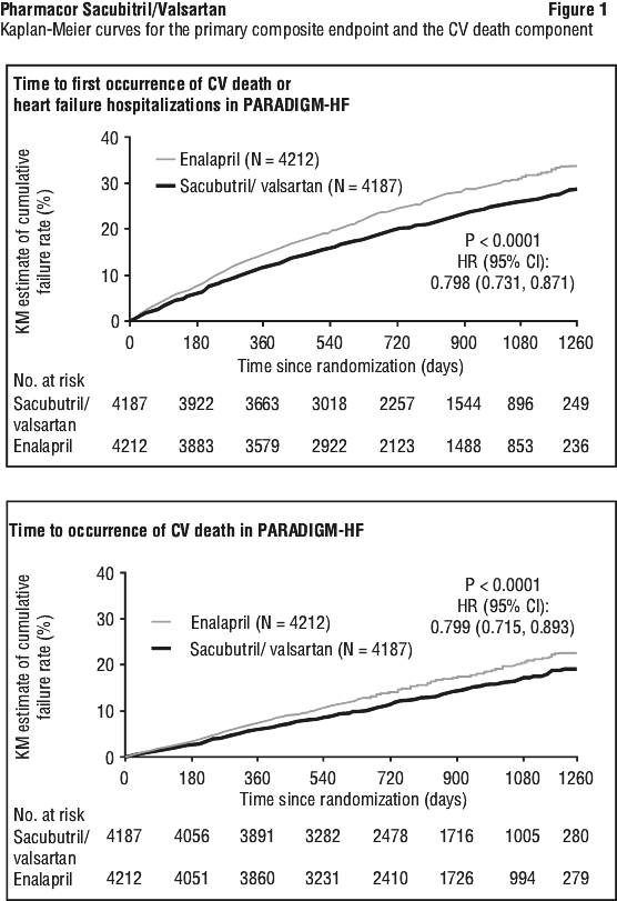 The Kaplan-Meier presented in Figure 1 (top) shows time to first occurrence of the primary composite endpoint of CV death or heart failure hospitalisation. Sacubitril/valsartan treatment effect was evident early and sustained for the duration of the study. The Kaplan-Meier Figure 1 (bottom) shows the time to CV death endpoint.