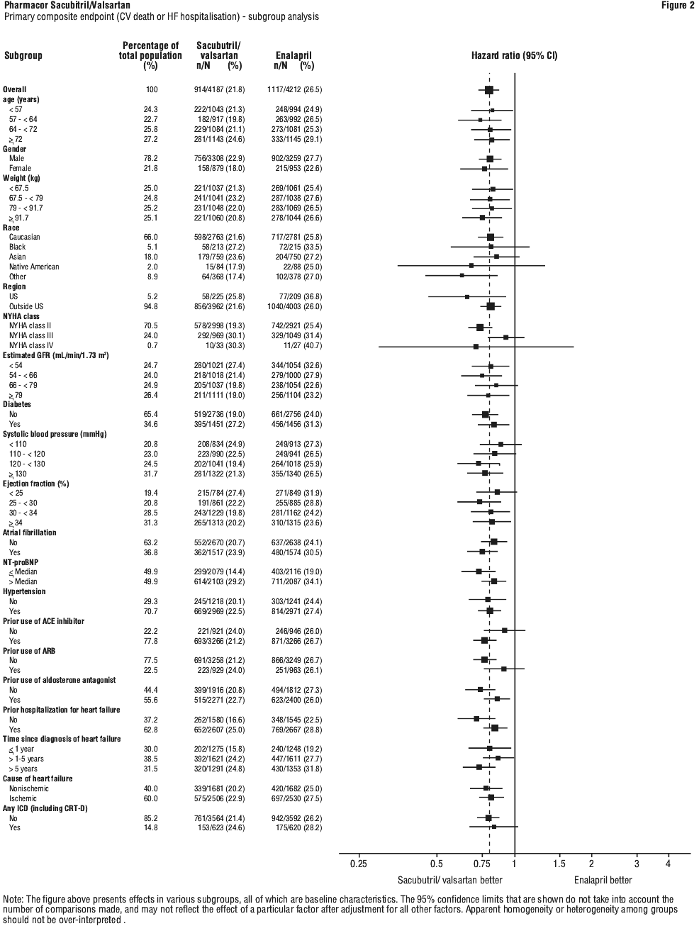 The population was 66% Caucasian, 18% Asian, and 5% Black; the mean age was 64 years (19% of patients were 75 years or older); and 78% were male. At randomisation, 70% of patients were NYHA class II, 24% were NYHA class III, and 0.7% were NYHA class IV. The mean left ventricular ejection fraction was 29%. There were 11.4% of patients with a baseline left ventricular ejection fraction > 35 and ≤ 40%. Median NT-proBNP level at study enrollment was 1,629 picogram/mL for sacubitril/valsartan-treated patients, and 1,593 picogram/mL for enalapril-treated patients. Median BNP levels at study enrollment was 255 picogram/mL for sacubitril/valsartan-treated patients, and 251 picogram/mL for enalapril-treated patients. The underlying cause of heart failure was coronary artery disease in 60% of patients; 71% had a history of hypertension, 43% had a history of myocardial infarction, 37% had an eGFR < 60 mL/min/1.73 m2, and 35% had diabetes mellitus. Most patients were taking betablockers (94%), mineralocorticoid antagonists (58%), and diuretics (82%). Few patients had an implantable cardioverter-defibrillator (ICD) or cardiac resynchronisation therapy defibrillator (CRT-D) (15%).