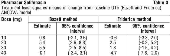 Moxifloxacin was included as a positive control in this study and, given the length of the study, its effect on the QT interval was evaluated in 3 different sessions. The placebo subtracted mean changes (90% confidence interval) in QTcF for moxifloxacin in the three sessions were 11 msec (7, 14), 12 msec (8,17) and 16 msec (12, 21), respectively. Solifenacin (3R)-1-azabicyclo[2.2.2]oct-3yl(1S)-1-phenyl-3,4-dihydroisoquinoline-2(1H)carboxylate monosuccinate.