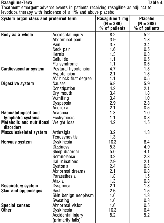 Other events that occurred at an incidence of < 1% of patients receiving rasagiline as adjunct to levodopa therapy, and were more frequent than in placebo are listed below within body system categories.