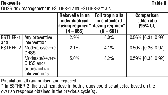 The cumulative incidence of moderate/severe OHSS and/or preventive interventions for early OHSS across three stimulation cycles were significantly lower for Rekovelle in an individualised dosing regimen compared to follitropin alfa in a standard dosing regimen (p < 0.05). See Table 8.
