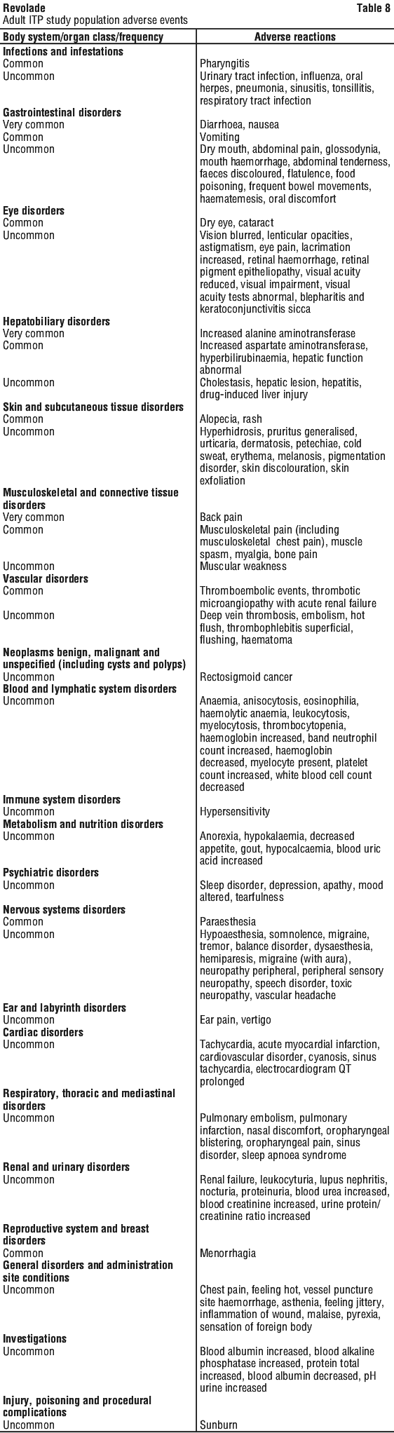 In 3 controlled and 2 uncontrolled clinical studies, among adult chronic ITP patients receiving Revolade (n = 446), 17 subjects experienced a total of 19 TEEs, which included (in descending order of occurrence) deep vein thrombosis (n = 6), pulmonary embolism (n = 6), acute myocardial infarction (n = 2), cerebral infarction (n = 2), embolism (n = 1) (see Section 4.4 Special Warnings and Precautions for Use).