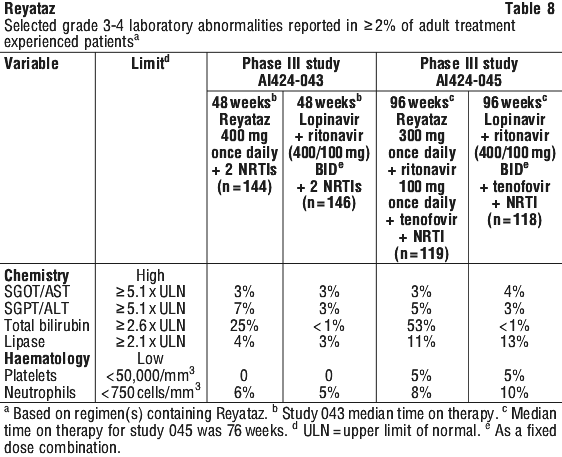 The percentages of adult treatment-experienced patients treated with combination therapy including Reyataz with Grade 3-4 laboratory abnormalities are presented in Table 8.