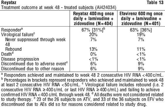 The proportion of responders among patients with high viral loads (i.e. baseline HIV RNA ≥ 100,000 copies/mL) was comparable for the Reyataz/ ritonavir (74% at both 48 weeks and 96 weeks) and lopinavir/ ritonavir arms (72% at 48 weeks and 66% at 96 weeks). The median increase from baseline in CD4+ cell count was 191 (48 weeks) and 261 (96 weeks) cells/mm3 for the Reyataz/ ritonavir arm and 200 (48 weeks) and 273 (96 weeks) cells/mm3 for the lopinavir/ ritonavir arm.