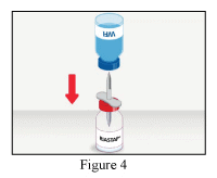 - Remove the safety cap from the other end of the transfer set, invert the WFI vial, apply gentle pressure to pierce the stopper and transfer the contents into the RiaSTAP® vial (Figure 4).