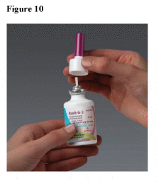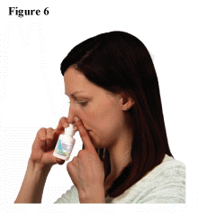 - Tilt your head forward slightly. Keep the bottle upright, and press down once quickly and firmly on the finger rests to activate the pump. Breathe in (inhale) gently through your nose as you spray. Then breathe out through your mouth. (See Figure 7)
