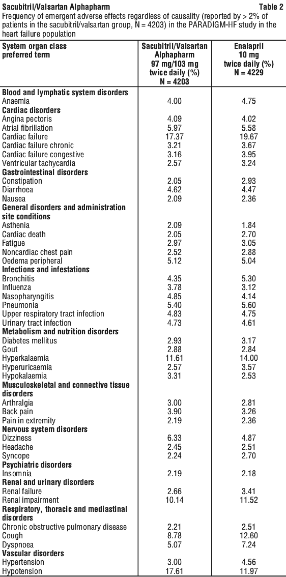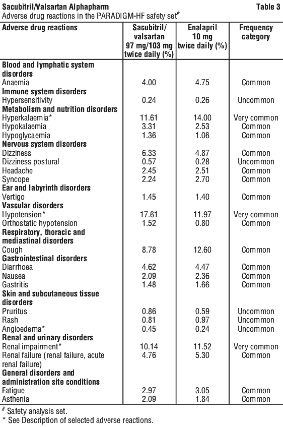 In PARADIGM-HF, renal impairment was reported in 10.1% of sacubitril/valsartan-treated patients and 11.5% of enalapril-treated patients.