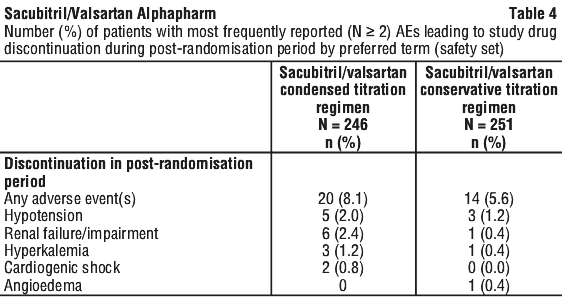 If patients experience tolerability issues (systolic blood pressure ≤ 95 mmHg, symptomatic hypotension, hyperkalaemia, renal dysfunction), consideration should be given to adjustment of concomitant medications, or to temporary down-titration or discontinuation of Sacubitril/Valsartan Alphapharm.