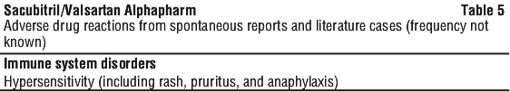 The following adverse drug reactions have been derived from post-marketing experience with sacubitril/valsartan via spontaneous case reports and literature cases. Because these reactions are reported voluntarily from a population of uncertain size, it is not possible to reliably estimate their frequency, which is therefore categorised as not known. Adverse drug reactions are listed according to system organ classes in MedDRA (see Table 5).