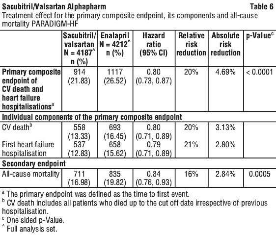 Sacubitril/valsartan demonstrated clinically relevant and statistically significant superiority to enalapril, reducing the risk of cardiovascular death or heart failure hospitalisations by 20% (hazard ratio (HR): 0.80, 95% CI [0.73; 0.87], 1-sided p < 0.0001) versus enalapril. This effect was observed early and was sustained throughout the duration of the trial. The absolute risk reduction was 4.69%. A statistically significant reduction for CV death and first HF hospitalisation was observed (CV death, RRR 20%, HR 0.80; 95% CI [0.71, 0.89]; and hospitalisation for heart failure RRR 21%; HR 0.79; 95% CI [0.71, 0.89]) (see Table 6 and Figure 1). Sudden death accounted for 45% of cardiovascular deaths and was reduced by 20% in sacubitril/valsartan treated patients compared to enalapril treated patients (HR 0.80). Pump failure accounted for 26% of cardiovascular deaths and was reduced by 21% in sacubitril/valsartan treated patients compared to enalapril treated patients (HR 0.79).