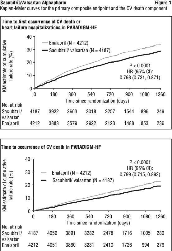 The Kaplan-Meier presented in Figure 1 (top) shows time to first occurrence of the primary composite endpoint of CV death or heart failure hospitalisation. Sacubitril/valsartan treatment effect was evident early and sustained for the duration of the study. The Kaplan-Meier figure presented in Figure 1 (bottom) shows the time to CV death endpoint.