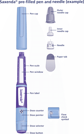 - Check the name and coloured label of your pen, to make sure that it contains Saxenda®. This is especially important if you take more than one type of injectable medicine. Using the wrong medicine could be harmful to your health.