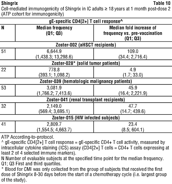 At 3 years post-dose 2, the median fold increase over baseline was 9.3 (Q1: 4.9; Q3: 19.5) in adults ≥ 50 years (Zoster-006) and 7.2 (Q1: 3.5; Q3: 14.5) in adults ≥ 70 years (pooled Zoster-006 and Zoster-022). At 3 years post-dose 2, in Zoster-006, the median fold increase over baseline was 7.9 (Q1: 2.7; Q3: 31.6) in adults ≥ 50 years and 7.3 (Q1: 1.7; Q3: 31.6) in adults ≥ 70 years.