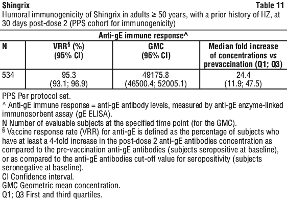 In the eleventh year after vaccination, the efficacy against HZ was 82.0% (95% CI: 63.0; 92.2) and 72.0% (95% CI: 33.4; 89.8) in subjects ≥ 50 years (Shingrix group: N=5,849) and subjects ≥ 70 years (Shingrix group: N=2,891), respectively. At 3 years post-dose 2, the median fold increase over baseline was 9.3 (Q1: 4.9; Q3: 19.5) in adults ≥ 50 years (Zoster-006) and 7.2 (Q1: 3.5; Q3: 14.5) in adults ≥ 70 years (pooled Zoster-006 and Zoster-022).