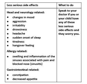 After you have received medical advice for any side effects you or your child experiences, you can report side effects to the Therapeutic Goods Administration online at www.tga.gov.au/reporting-problems. By reporting side effects, you can help provide more information on the safety of this medicine.